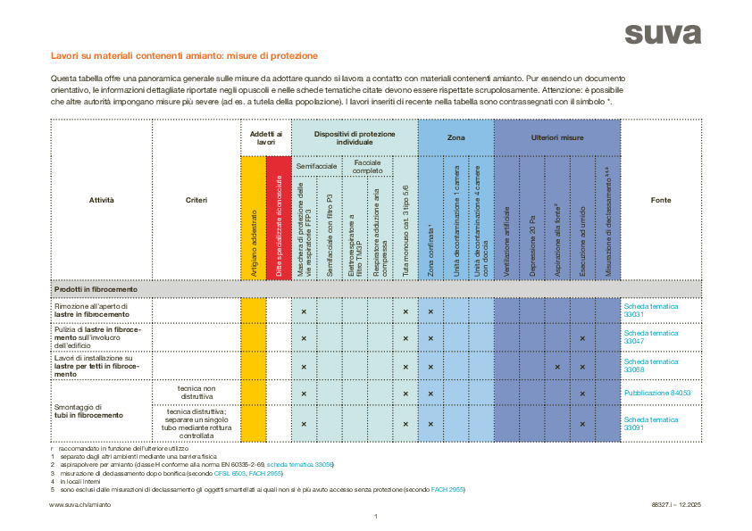 Per la lavorazione o la rimozione dei materiali da costruzione contenenti amianto, a seconda della loro natura sono necessarie misure di protezione specifiche. Cordoni di amianto, rivestimenti piastrellati con colla a base di amianto o intonaco contenente amianto sono pericolosi e generalmente devono essere affidati alle aziende specializzate in bonifiche da amianto. La situazione è diversa per l'isolamento dei tubi o la perforazione di rivestimenti per pareti e pavimenti contenenti amianto. In ogni caso, per tutti i lavori su materiali contenenti amianto dovete garantire che il personale non inali la pericolosa polvere di amianto. Per fornirvi un riepilogo delle misure necessarie, abbiamo preparato una tabella che mostra: Nell'ultima colonna trovate i numeri di riferimento di bollettini e schede tematiche sugli specifici argomenti. Queste pubblicazioni descrivono in modo dettagliato come procedere per i lavori sui materiali contenenti amianto per proteggere il personale dalle fibre nocive per la salute.
