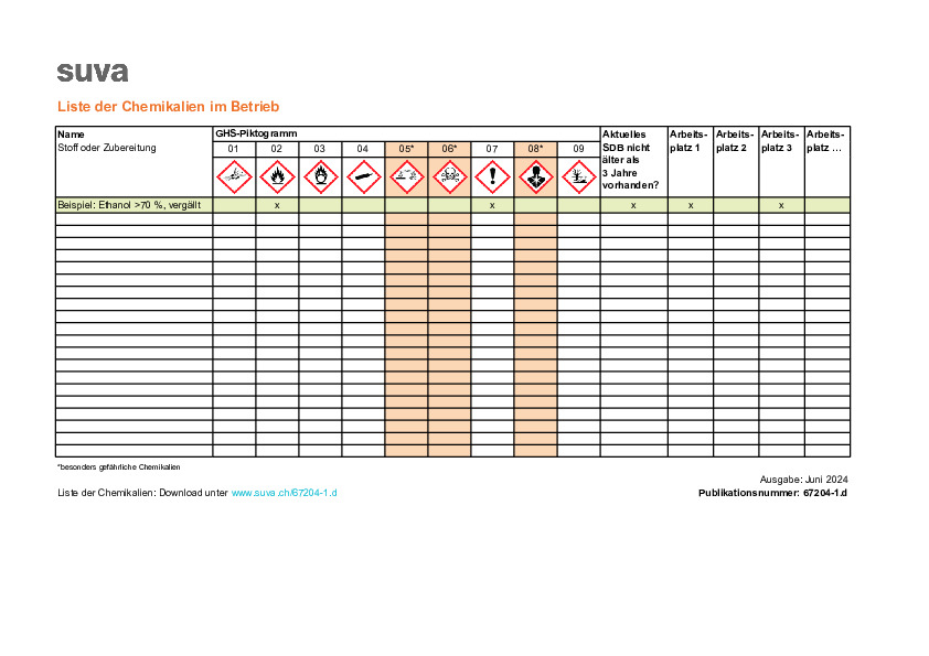 In vielen Betrieben kommen gesundheitsgefährdende Stoffe zum Einsatz. Diese werden in Betrieben für verschiedene Tätigkeiten eingesetzt und können bei unsachgemässem Umgang zu Berufskrankheiten führen, die irreversible Schäden und hohe Kosten zur Folge haben. Umso wichtiger ist es, dass Sie sich einen Überblick über die im Betrieb verwendeten Stoffe und Zubereitungen verschaffen und die besonders gefährlichen Chemikalien in Ihrem Betrieb identifizieren, um geeignete und wirksame Massnahmen für einen sicheren Umgang treffen zu können. Die Checkliste behandelt die folgenden Themenkreise: Laden Sie die Checkliste jetzt herunter und sorgen Sie für mehr Sicherheit beim Umgang mit gesundheitsgefährdenden Stoffen. Ergänzend empfehlen wir Ihnen auch unsere Merkblatt Gefährliche Stoffe. Was man darüber wissen muss. Weitere Informationen zum Thema finden Sie auf unseren Seiten www.suva.ch/cmr und www.suva.ch/substitution.