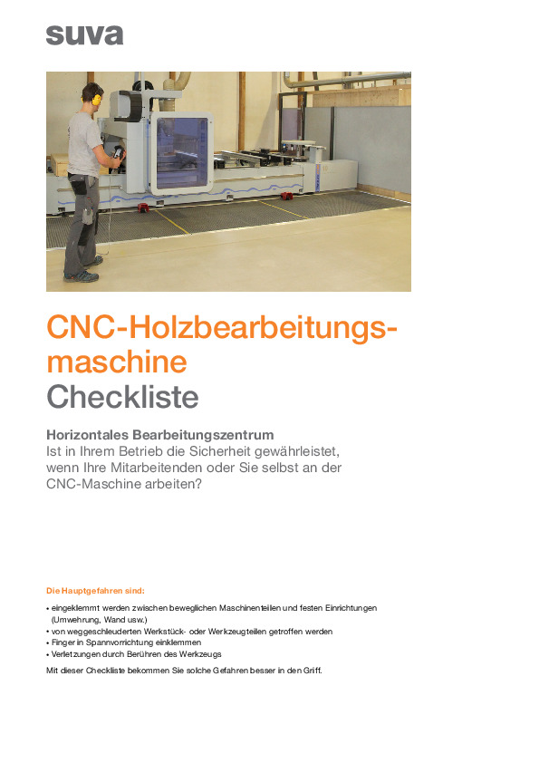 Die Unfall- und Verletzungsgefahren an computergesteuerten CNC-Holzbearbeitungsmaschinen sind beträchtlich. Zum Beispiel können Personen oder Gliedmassen von beweglichen Teilen eingeklemmt werden. Ausserdem besteht das Risiko, dass weggeschleuderte Teile Personen im Gefahrenbereich treffen. CNC-Maschinen müssen über feste Schutzeinrichtungen verfügen, die das Bedienpersonal vor Verletzungen schützen. Weiter gilt es den Mindestabstand einzuhalten. Bei nicht trennenden Schutzeinrichtungen dürfen sich während des Betriebs keine Personen in der Gefahrenzone aufhalten. Nutzen Sie unsere Checkliste, um die Gefahren in Ihrem Betrieb systematisch zu ermitteln und die notwendigen Massnahmen umsetzen. Dazu gehört die Instruktion der Mitarbeitenden und das Erstellen von betriebsspezifischen Sicherheitsregeln für das sichere Arbeiten am CNC-Bearbeitungszentrum. Unser Merkblatt «Regeln schaffen Klarheit» unterstützt Sie in der Erarbeitung solcher Regeln. Die Checkliste zeigt auch verschiedene Lösungsansätze für nicht trennende Schutzeinrichtungen. Beachten Sie weiter die Checkliste «CNC-Maschine zum Bohren, Drehen und Fräsen» für Informationen zum sicheren Arbeiten an Bearbeitungszentren.