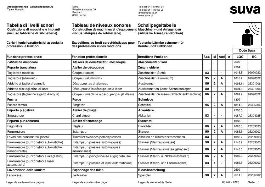 Eine hohe Lärmbelastung am Arbeitsplatz kann die Gesundheit bleibend schädigen. Personen, die immer wieder starkem Lärm ausgesetzt sind, droht ein bleibender Hörverlust. Daher gelten strenge Vorschriften für die Schallemission und Schalldruckpegel am Arbeitsplatz. Um die Gesundheit Ihrer Mitarbeitenden wirksam schützen zu können, müssen Sie wissen, wie hoch die Schallpegel in Ihrem Betrieb überhaupt sind. Da entsprechende Messungen recht komplex sind, haben wir für den Maschinenbau eine Tabelle erarbeitet. Diese Tabelle listet die typische Lärmbelastung der einzelnen Berufe und Funktionen auf und bestimmt typische Lärmquellen, Zonen und Tätigkeiten. So zeigen wir Ihnen direkt, für welche Mitarbeitenden Sie Lärmschutzmassnahmen treffen sollten. Laden Sie die Schallpegeltabelle für den Maschinenbau jetzt herunter und überprüfen Sie, welche Arbeitsplätze und Mitarbeitenden einer zu hohen Geräuschemission ausgesetzt sind. Im Verzeichnis für Schallpegeltabellen finden Sie weitere Wertetabellen für andere Branchen und Betriebe mit hoher Lärmbelastung.