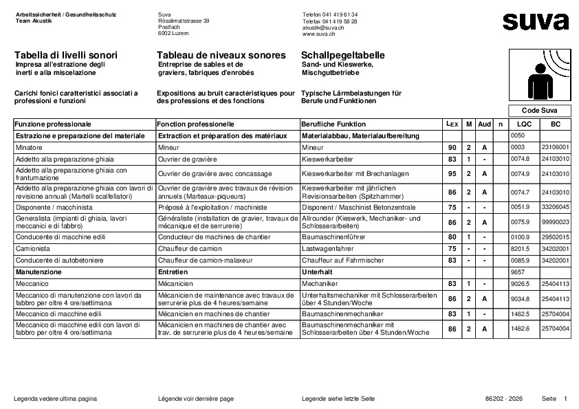 Um die Gesundheit Ihrer Mitarbeitenden wirksam schützen zu können, müssen Sie wissen, wie hoch die Schallpegel in Ihrem Betrieb überhaupt sind. Da entsprechende Messungen recht komplex sind, haben wir für Sand- und Kieswerke eine Tabelle erarbeitet. Diese Tabelle listet die typische Lärmbelastung der einzelnen Berufe und Funktionen auf und bestimmt typische Lärmquellen, Zonen und Tätigkeiten. So zeigen wir Ihnen direkt, für welche Mitarbeitenden Sie Lärmschutzmassnahmen treffen sollten.
