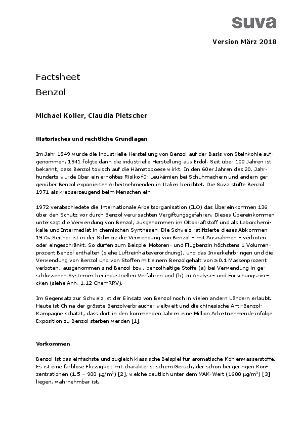 In der Schweiz gilt seit 1975 ein Verbot für den Einsatz von Benzol. Einzige Ausnahmen sind die Beimischung in Benzin sowie bestimmte Anwendungen in der Industrie und zu Forschungs- und Analysezwecken. Benzol wirkt auf Haut und Schleimhäute reizend, eine hohe Konzentration kann zu einer schweren Vergiftung führen. Der Stoff ist toxisch für die Bildung der Blutkörperchen und gilt als gesichert krebserregend beim Menschen. Bereits in den 1960er-Jahren wurde über den Zusammenhang von benzolhaltigen Klebern in der italienischen Schuhindustrie und Fällen von Leukämie berichtet. Expositionen sind heute jedoch nur noch selten, weshalb Krebserkrankungen meist auf frühere Tätigkeiten mit Benzol zurückzuführen sind. Wir gehen von einer durch Benzol ausgelösten malignen Neoplasie alle drei Jahre aus. Für die Anerkennung einer durch Benzol ausgelösten Berufskrankheit oder um eine mögliche Gefahr einer Benzolvergiftung zu beurteilen, muss ein Airmonitoring (MAK-Wert) zusammen mit einem Biomonitoring (BAT-Wert) durchgeführt werden. Das Factsheet «Benzol» fasst den aktuellen Wissenstand über Benzol in der Arbeitsmedizin sowie die geltenden Grenzwerte zusammen. Laden Sie das Factsheet jetzt herunter und informieren Sie sich zum Thema. Weitere Informationen finden Sie auf unserer Seite «Arbeitsmedizin».