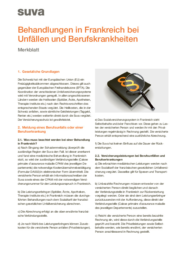 Bei Behandlungen infolge Unfall oder Berufskrankheiten im Ausland gelten besondere Bedingungen des Leistungsumfangs. In der Europäischen Union und den Ländern der EFTA werden diese durch das europäische Freizügigkeitsabkommen geregelt. Dabei gilt, dass in allen angeschlossenen Ländern die Heilkosten nach den Rechtsvorschriften des jeweiligen Landes vergütet werden. In Frankreich ist die Caisse primaire d'assurance maladie (CPAM) des jeweiligen Départements für die Kostenabrechnung zuständig. Die Suva fungiert als Verbindungsstelle zu der zuständigen CPAM. Bei Berufsunfällen oder Berufskrankheit werden die Behandlungskosten wie folgt abgerechnet: Behandlungskosten im Zusammenhang mit einem Freizeitunfall werden in Frankreich über die Gemeinsame Einrichtung KVG abgerechnet. Wir empfehlen Ihnen, sich mit den in unserem Merkblatt beschriebenen Regelungen vertraut zu machen. So sind Sie auf der sicheren Seite, sollte eine medizinische Behandlung infolge Unfall oder Berufskrankheit in Frankreich erforderlich werden.