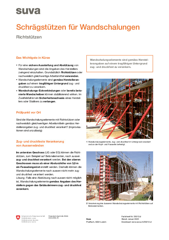 Wenn Wandschalungen ungenügend gesichert sind, können sie leicht umkippen – mit fatalen Folgen. Sie müssen daher zwingend mit Schrägstützen fachgerecht gesichert werden. Unser Factsheet mit Sicherheitshinweisen zu Schrägstützen/Richtstützen hilft Ihnen, in Ihrem Betrieb gravierende Unfälle zu vermeiden. Das Wichtigste zuerst: Halten Sie für die sichere Abstützung von Wandschalungen bei jedem Arbeitsschritt unbedingt die Herstellerangaben ein. Improvisation verträgt es nicht. Beachten Sie zudem die folgenden Punkte: Bei Aussenwänden präsentieren sich grundsätzlich zwei Situationen: Im UG oder EG lassen sich die Richtstützen beispielsweise auf Betonelementen befestigen. Bei oberen Geschossen hingegen ist ab einer Absturzhöhe von drei Metern ein Fassadengerüst vorgeschrieben. Dadurch können die Wandschalungselemente nach aussen nicht mehr zug- und druckfest verankert werden. Die Lösung: eine Verankerung gegen das Gebäudeinnere. Ein umfallendes Wandschalungselement kann eine Person unter sich begraben und sie schwer oder gar tödlich verletzen. Unser Factsheet benennt auch die häufigsten Unfallursachen, um Sie und Ihre Mitarbeitenden zu sensibilisieren und dadurch Schäden und Verletzungen zu vermeiden. Ergänzend haben wir die relevanten Normen aufgeführt. Weitere Informationen finden Sie auch in den folgenden Factsheets: Deckenstützen, Wandschalungen, Betonierbühnen und Gegengeländer sowie Deckenschalungen.