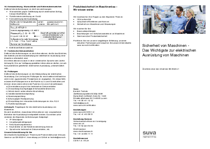Gemäss der Richtlinie 2006/42/EG (Maschinenrichtlinie Damit Sie sich darüber rasch einen Überblick über die Norm EN 60204-1 verschaffen können, gibt es diesen Faltprospekt. Dieser bietet Ihnen einen Überblick über wesentliche Inhalte der elektrischen Ausrüstung in der EN 60204-1. Sie finden in diesem Faltprospekt sowohl eine Normübersicht wie auch Ausführungen zu den Inhalten der Norm. Dabei haben wir für Sie die wesentlichen Informationen pro Abschnittsnummer der Norm zusammengefasst. So erfahren Sie schnell das Wichtigste über die Sicherheit und die elektrische Ausrüstung von Maschinen und maschinellen Anlagen. Neben diesen Informationen bieten wir Ihnen auch Kurse, Beratung und Zertifizierungen – wir sind Ihre Expertinnen und Experten rund um Produktesicherheit. Weitere Factsheets sowie alle Infos zu unserem Angebot finden Sie auf unserer Website. Laden Sie den Faltprospekt jetzt herunter, um einen Überblick über die elektrische Ausrüstung von Maschinen und Maschinenanlagen zu gewinnen.
