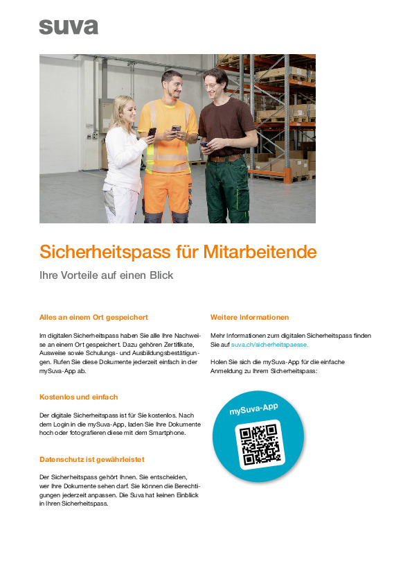 In den digitalen Sicherheitspässen sehen Betriebe, welche Schulungen ihre Mitarbeitenden absolviert haben und wo noch Handlungsbedarf besteht. Die Nachweise der geleisteten Ausbildungen je Mitarbeiter/-in sind übersichtlich und digital im Kundenportal mySuva und in der App mySuva einzusehen. Mit diesem neuen Online-Service können den Mitarbeitenden auch Lerninhalte oder Einladungen für Instruktionen vor Ort zugewiesen werden. Damit stellen Betriebe sicher, dass alle Mitarbeitenden über das nötige Wissen verfügen. Die Mitarbeitenden entscheiden, wer ihre Dokumente, Nachweise etc. einsehen darf. Sie können Berechtigungen erteilen und jederzeit anpassen. Die Suva hat keinen Einblick in die Sicherheitspässe von Mitarbeitenden. Der digitale Sicherheitspass ist kostenlos. Weitere Informationen auf www.suva.ch/sicherheitspaesse.