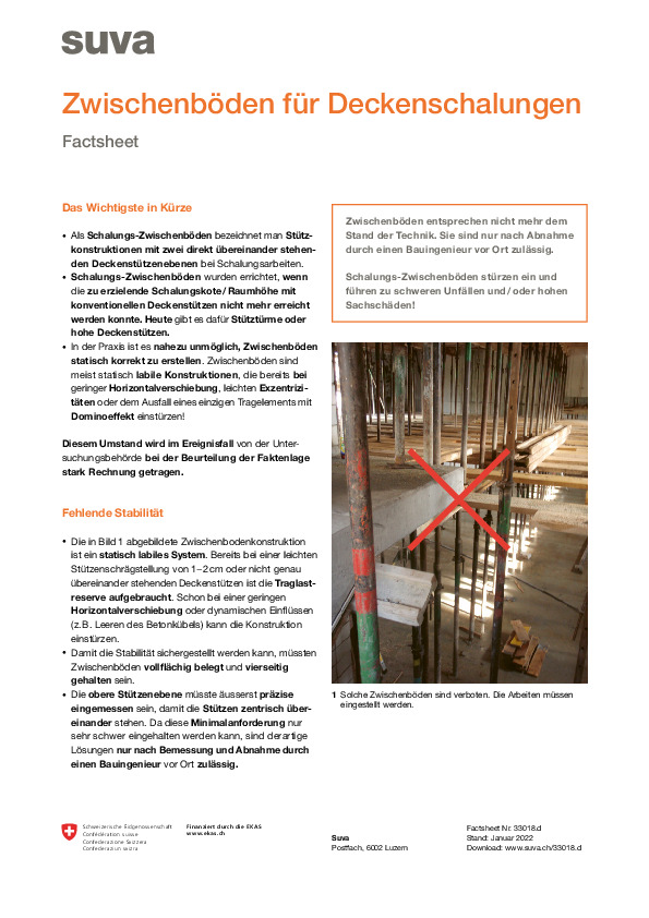 Zwischenböden für Deckenschalungen entsprechen nicht mehr dem Stand der Technik. Aufgrund der latenten Einsturzgefahr wurde das Risiko für schwerwiegende Unfälle und hohen Sachschaden als gross eingestuft. Somit sind Schalungs-Zwischenböden nur noch dann zulässig, wenn sie von einer Bauingenieurin oder einem Bauingenieur vor Ort abgenommen wurden. Das sind die Gründe, weshalb Sie auf diese Schalungstechnik verzichten sollten: Fazit dieses Factsheets: Wir raten Ihnen von dieser Stützkonstruktion ab und empfehlen Ihnen den Einsatz zeitgemässer Schalungssysteme, die auch in puncto Sicherheit überzeugen. Bedenken Sie, dass Sie bei der Planung von Bauarbeiten das Risiko von Unfällen möglichst klein halten müssen. Wenn Sie weiterhin mit labilen Schalungs-Zwischenböden arbeiten und Mitarbeitende zu Schaden kommen oder Sachschaden entsteht, kann dies zu einer Untersuchung führen. Und dann kommen Sie als Unternehmen schnell in Erklärungsnot. Im Zusammenhang mit diesem Thema empfehlen wir Ihnen unsere drei Factsheets Deckenstützen, Schalungsträger für Decken und Deckenschalungen grosse Raumhöhen. Dort zeigen wir Ihnen, wie Sie Schalungsarbeiten sicher ausführen.
