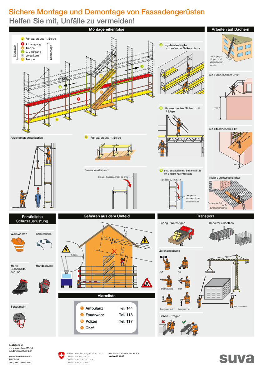 Eine gute Instruktion ist wie ein stabiles Gerüst: Sie ermöglicht ein sicheres Arbeiten und hilft, Unfälle zu vermeiden. Leider sind rein verbale «Vorträge» oft nicht nachhaltig. Dies gilt insbesondere dann, wenn Sie Lernende, junge Berufsleute und Aushilfen aufklären möchten. Mit unserem Instruktionsblatt können Sie Ihr Wissen zu den Sicherheitsaspekten rund um die Montage und Demontage von Fassadengerüsten anschaulich vermitteln. Das A3-Blatt illustriert: Nach Ihrer Instruktion können Sie das Instruktionsblatt als Plakat an einem günstigen Ort in Ihrem Betrieb aufhängen. So übernimmt es die Funktion einer Erinnerungsstütze. Darüber hinaus ist es ein klares Statement: Das Unternehmen erwartet von allen, dass die hier aufgeführten Vorgaben befolgt werden. Damit die auf dem Instruktionsblatt vermerkten Notfallnummern nie angewählt werden müssen. Ergänzend empfehlen wir Ihnen auch unser Instruktionsblatt Sicheres Fassadengerüst. Für weitere Informationen besuchen Sie unsere Seite Sichere Arbeitsgerüste