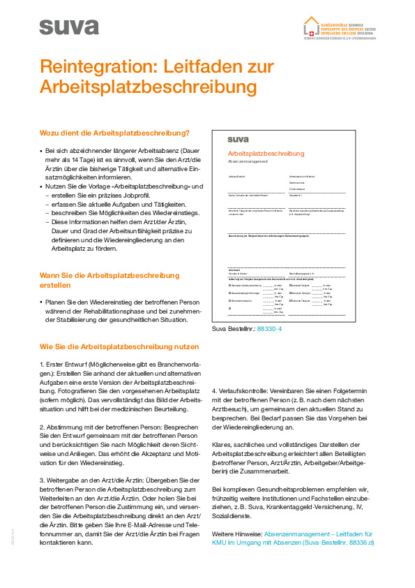 Bei längeren Abwesenheiten kann es sinnvoll sein, den Arzt oder die Ärztin über die bisherigen Tätigkeiten oder alternativen Aufgaben der betroffenen Person zu informieren. Dies geschieht über das Formular «Arbeitsplatzbeschreibung». Der Leitfaden unterstützt Sie beim Ausfüllen der Vorlage. Im Leitfaden werden insbesondere folgende Kernfragen beantwortet: • Wozu dient die Arbeitsplatzbeschreibung? • Wann sollten Sie die Arbeitsplatzbeschreibung erstellen? • Wie können Sie die Arbeitsplatzbeschreibung nutzen?