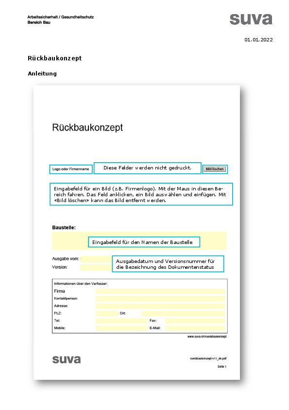 Damit Ihr Rückbaukonzept alle Vorgaben gemäss Bauarbeitenverordnung (BauAV, Art. 81) Das Dokument umfasst folgende Positionen: Hinweis: Das Formular können Sie nur mit dem Adobe Reader vollumfänglich nutzen. Klicken Sie hier, um die aktuelle Version herunterzuladen.