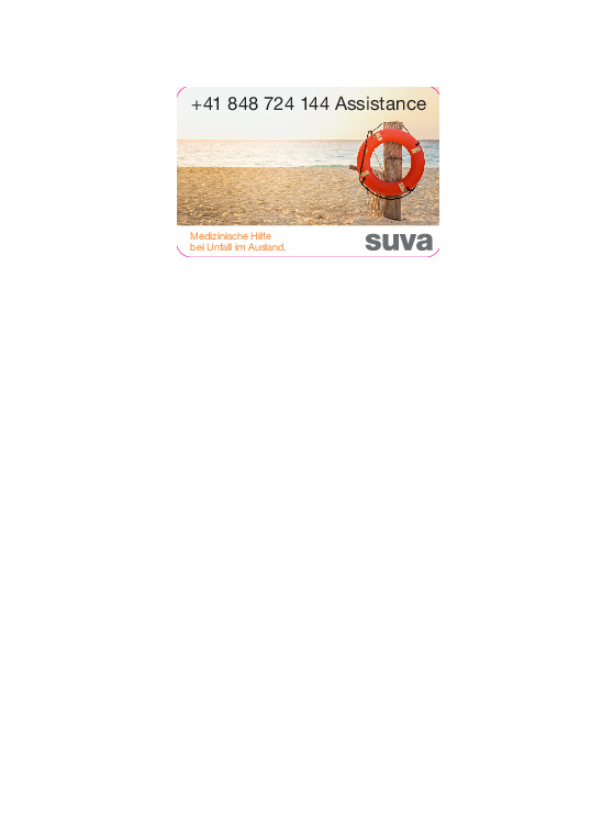 Wir sind auch im Ausland für unsere Versicherten da. Dank Assistance erhalten Versicherte, die sich vorübergehend im Ausland aufhalten, im Notfall Schutz, Beratung und medizinische Hilfe. Zu den Versicherungsleistungen gehören eine 24-Stunden-Helpline sowie ein weltweites Versorgungsnetz. Assistance kümmert sich auch um die Betreuung vor Ort sowie einen allfälligen Rücktransport nach Hause. Voraussetzung für die Versicherungsdeckung ist, dass Sie bei der Suva gegen Nichtbetriebsunfälle versichert sind. Gegen Nichtbetriebsunfälle automatisch versichert sind Angestellte mit einem Arbeitspensum von mindestens acht Stunden pro Woche. Falls Sie unsicher sind, erkundigen Sie sich bei Ihrem Arbeitgeber. So können Sie beruhigt verreisen. Der Aufkleber mit der Telefonnummer der Assistance gehört in jedes Reisegepäck. Damit wissen Sie sofort, an wen Sie sich bei einem Unfall in den Ferien im Ausland wenden können. Laden Sie die Vorlage herunter oder bestellen Sie den Aufkleber direkt hier online. Machen Sie Ihre Mitarbeitenden auf die Versicherungsdeckung durch die Assistance aufmerksam, indem Sie den Aufkleber vor der Feriensaison auflegen oder verteilen lassen. Weitere Informationen erhalten Sie auf der Seite «Assistance - Soforthilfe im Ausland».