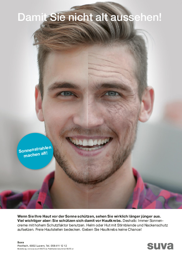 Sind Sie sicher, dass vom Lernenden bis zum Profi jeder weiss, dass mit der Sonne nicht zu spassen ist? Falls nicht, empfehlen wir Ihnen, dieses Kleinplakat während der Sonnensaison aufzuhängen. Das ungewöhnliche Bild ist ein echter Stopper und macht deutlich, dass man schnell alt aussieht, wenn man seine Haut nicht vor der Sonne schützt. Es lohnt sich, Ihre Mitarbeitenden über die Auswirkungen der aggressiven UV-Strahlen zu informieren. Denn sie beschleunigen nicht nur den Alterungsprozess, sie sind auch für den Hautkrebs verantwortlich. Deshalb gehören eine Creme mit hohem Lichtschutzfaktor, ein Helm oder ein Hut sowie eine Stirnblende und ein Nackenschutz ebenso zur persönlichen Schutzausrüstung wie die Handschuhe und die Knieschoner. Zwar können Ihre Fachleute auch mit einem Knittergesicht arbeiten, aber wenn die Haut richtig Schaden genommen hat, beschränkt sich das nicht nur auf ein paar Falten. Mit unserem Kleinplakat geben Sie Ihrem Team einen Motivationsschub, besser auf die Gesundheit der Haut zu achten.