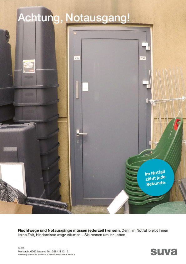 In einem Notfall wie zum Beispiel einem Brand müssen Ihre Mitarbeitenden das Gebäude rasch verlassen können. Das setzt einige Anforderungen an Notausgänge voraus. Ihre Mitarbeitenden müssen den Fluchtweg in Ihrem Betrieb kennen. Zeigen Sie deshalb neuen und temporären Mitarbeitenden immer auch, wo der Notausgang ist. Fluchtwege müssen erkennbar markiert sein – auch im Dunkeln. Denken Sie daran, dass ein Stromausfall und Rauch die Sicht behindern können. Ebenfalls wichtig ist, dass Sie Fluchtwege freihalten. Zu oft werden Rettungswege auch heute noch verstellt. In einem Notfall verlieren Sie wertvolle Zeit, wenn Sie den Fluchtweg zuerst freiräumen müssen. Sorgen Sie deshalb dafür, dass Fluchtwege immer frei sind. Instruieren Sie Ihre Mitarbeitenden dementsprechend und kontrollieren Sie Flucht- und Rettungswege regelmässig. Unser Plakat «Achtung, Notausgang!» dient als Erinnerung an Ihre Mitarbeitenden, dass Sie Notausgänge nicht verstellen dürfen – auch nicht für kurze Zeit. Das Plakat ermuntert sie auch, zu überlegen, wo sich der nächstgelegene Notausgang befindet und wie sie in einem Notfall am schnellsten das Gebäude verlassen können. Bestellen Sie das Plakat oder laden Sie es herunter. Hängen Sie es gut sichtbar im Büro oder an den Arbeitsplätzen auf. So sorgen Sie dafür, dass Ihre Mitarbeitenden im Notfall wissen, was zu tun ist.
