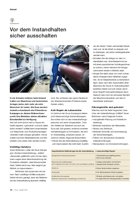 Was ist das Ziel der Suva-Kampagne zur Instandhaltung?