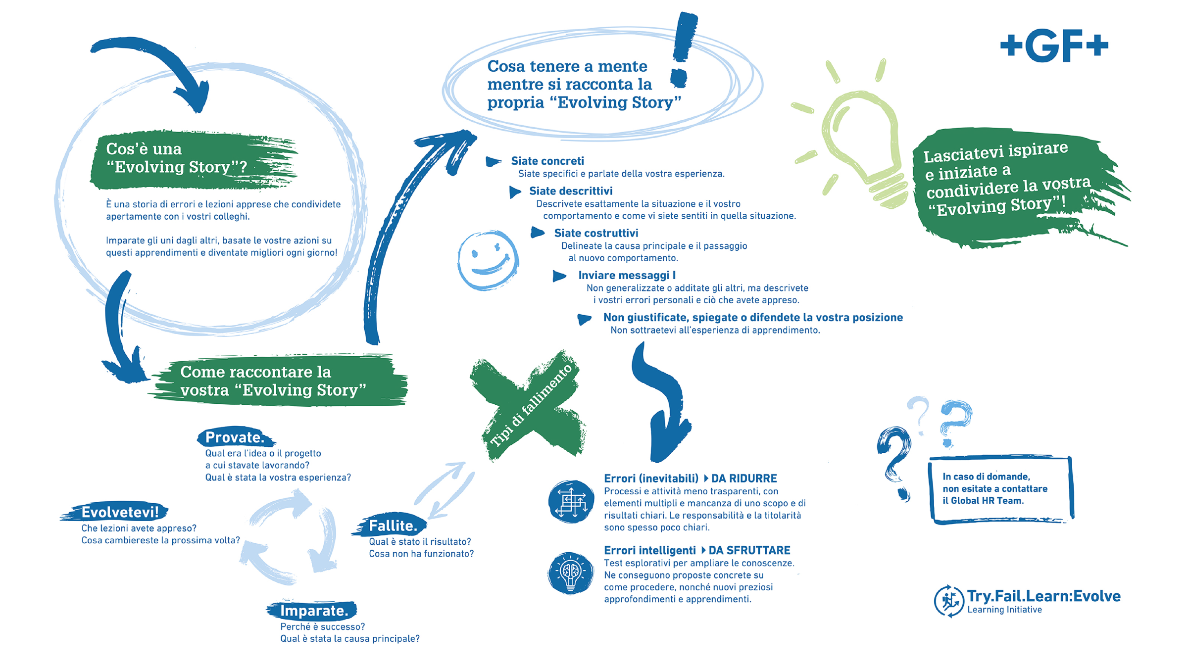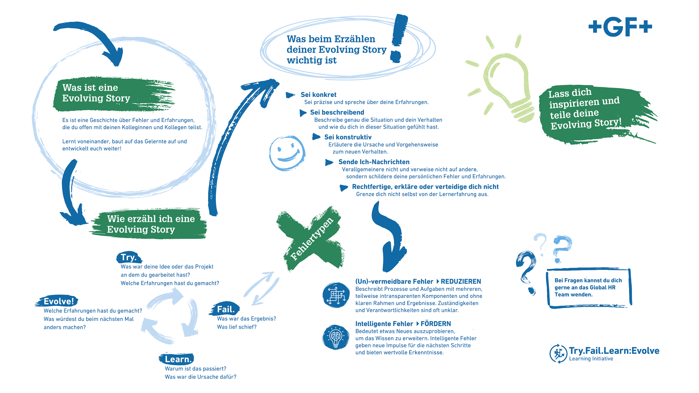 GF will den offenen Umgang mit Fehlern fördern. Ein Mittel dazu ist das Geschichtenerzählen. So genannte «Evolving Stories» erzählen von Fehlern und daraus gemachten Erfahrungen; diese sollen Mitarbeitende aller Stufen offen mit Kolleginnen und Kollegen teilen. Die Anleitung dazu sagt: «Lernt voneinander, baut auf das Gelernte auf und entwickelt euch weiter.» Eine Anleitung hilft den Mitarbeitenden, ihre Geschichte zu strukturieren: