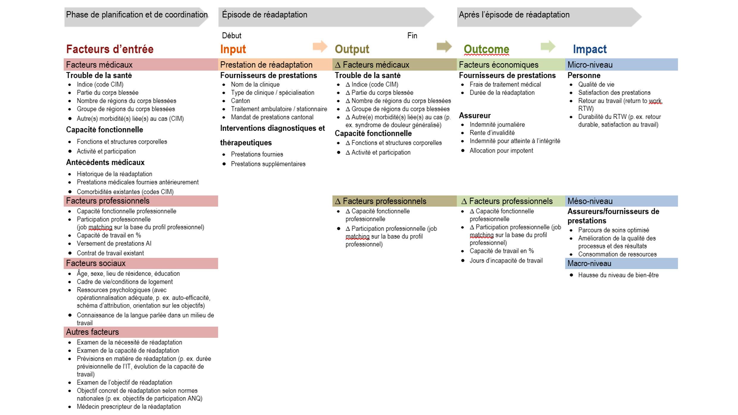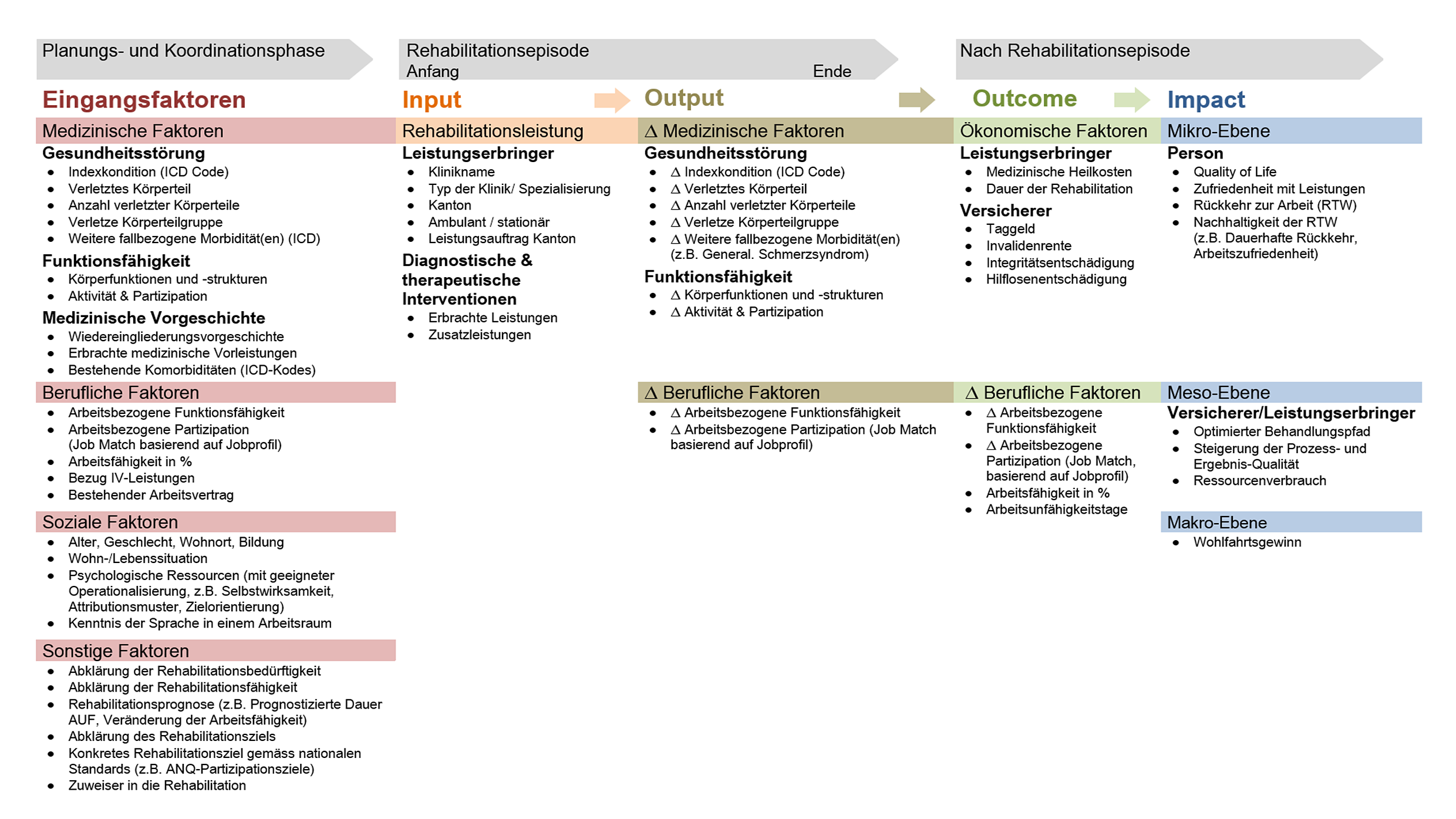 Voraussetzung für eine zielgerichtete Zuweisung der Patienten zu Rehabilitationsleistungen ist eine sorgfältige Abklärung der Rehabilitationsindikatoren basierend auf der Feststellung der Rehabilitationsbedürftigkeit (wenn die Teilhabe an der Gesellschaft durch einen gesundheitlichen Auslöser gefährdet oder schon eingeschränkt ist), der Rehabilitationsfähigkeit (die Fähigkeit im Rahmen der körperlichen und psychischen Verfassung des Patienten die therapeutischen Leistungen wahrnehmen zu können und zu wollen), der Rehabilitationsprognose sowie der Rehabilitationszielsetzung [33]. Es wird vorgeschlagen, die Abklärung der Rehabilitationsbedürftigkeit und der Rehabilitationsfähigkeit mit der Ausprägung «erfolgt/nicht erfolgt» in die Wirkungsmessung als sonstige Eingangsfaktoren aufzunehmen. Die Rehabilitationsprognose kann unter anderem durch die Dauer der Arbeitsunfähigkeit oder die Veränderung der Arbeitsfähigkeit operationalisiert werden. Die Rehabilitationsziele sollten sowohl in Form der Abklärung «erfolgt/nicht erfolgt», als auch in Form von konkret genannten Zielen basierend auf nationalen Standards, z. B. ANQ-Partizipationsziele, in die Wirkungsmessung einfliessen. Die Erfassung der Zuweiser (z. B. Akutspital oder andere Rehabilitationsklinik), welche Hinweise für die Steuerung von Zuweisungsprozessen liefern soll, ist für die Wirkungsmessung ebenfalls relevant.