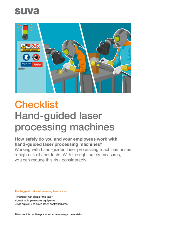 Working with hand-operated laser welding and laser cleaning machines poses a high risk of accidents. The main causes of accidents are the improper use of lasers, unsuitable protective equipment and an inadequately secured laser controlled area. Protect your employees against accidents by checking whether all safety requirements are being complied with within your organisation. Remind your team about the risks and show them how to use laser processing machines safely. Our checklist contains questions about general and technical safety requirements, the laser controlled area, personal protective equipment (PPE) and the mobile use of laser processing machines. Download the checklist now and ensure that everyone who works with hand-operated laser welding and laser cleaning machines in your organisation does so safely.