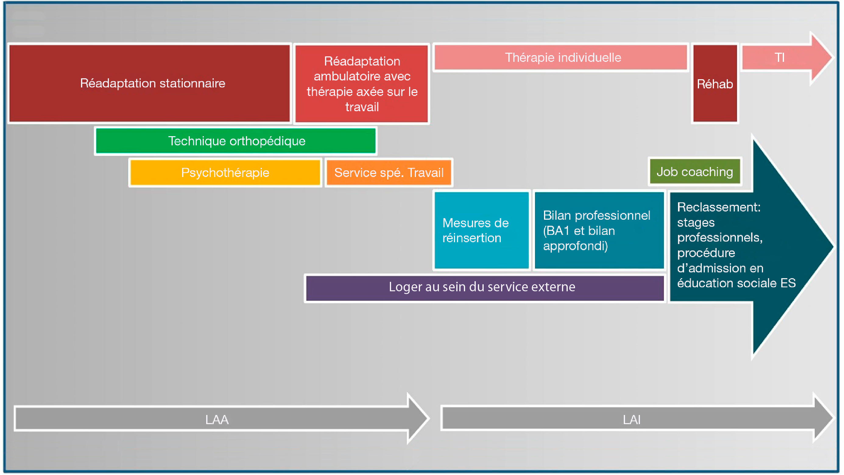 Par le passé, on a souvent attendu que la phase médicale soit terminée pour entamer la réinsertion professionnelle. Or, cette approche faisait perdre beaucoup de temps, d’espoir et de perspectives (ainsi que de potentiels emplois), ce qui favorisait une tendance à se limiter à la maladie et aux conséquences de l’accident ainsi que des évolutions chroniques.