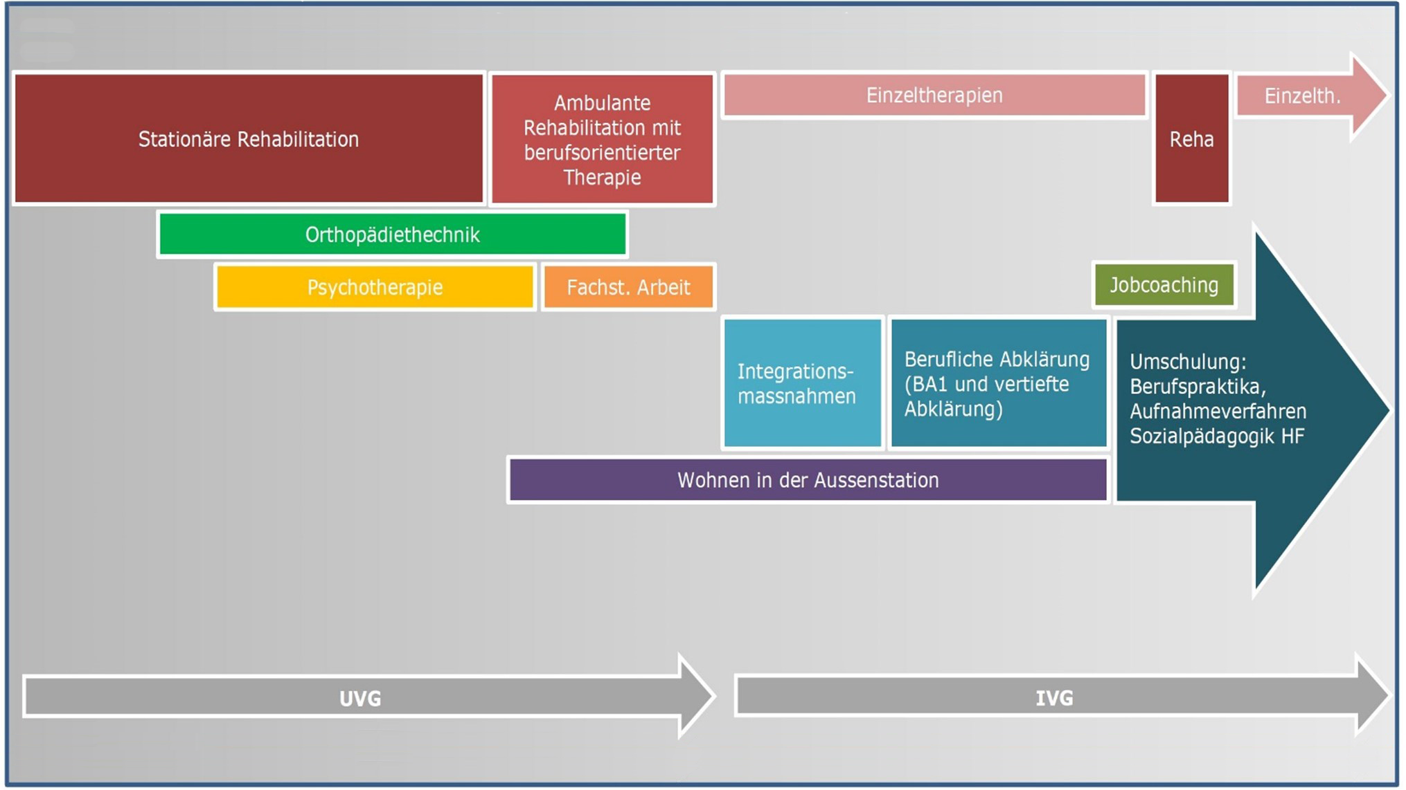 Ill. 1: Réadaptation globale sous la forme d’une combinaison d’offres stationnaires et ambulatoires et de l’intégration professionnelle à la lumière de l’exemple d’un patient présentant une neuroborréliose