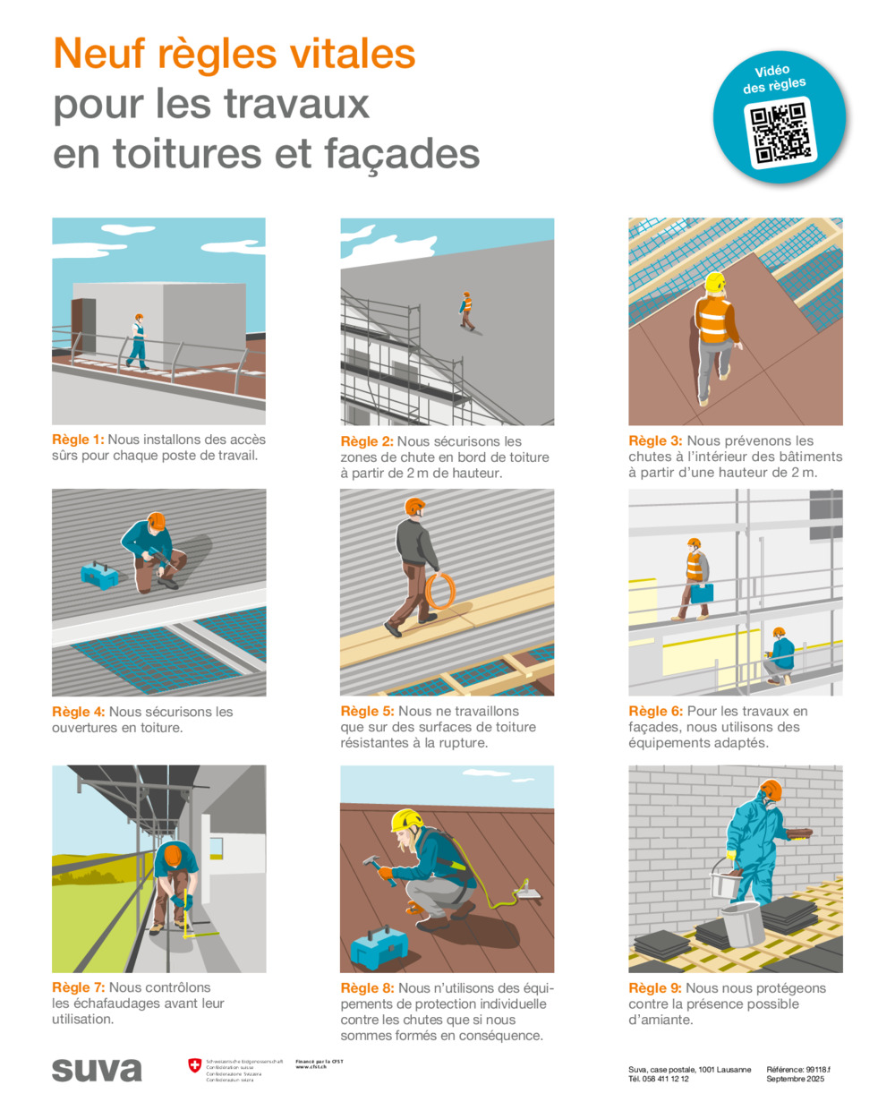 Il est à peu près certain que les membres de votre équipe ont déjà entendu parler des règles vitales. Et la plupart savent aussi qu’il est dans leur intérêt de les appliquer avec rigueur. Et malgré cela, il arrive que l’une ou l’autre règle soit oubliée. Grâce à notre affiche magnétique, votre équipe a toujours les neuf règles vitales sous les yeux avant d’entamer des travaux en façades ou en toitures. L’affiche A3 rappelle: Les dessins se focalisent sur les principaux risques liés aux travaux en toitures et en façades. Et comme les consignes de sécurité sont visualisées, elles peuvent également être comprises par les collègues de langue étrangère. De plus, l’affiche rappelle le principe directeur que chacun devrait connaître: «STOP en cas de danger – sécuriser – reprendre le travail». Pour une efficacité maximale, nous vous recommandons de placer l’affiche magnétique, extrêmement résistante, à un endroit bien visible. Sur notre page Internet Travaux sur les toits, vous trouverez de plus amples informations, des consignes de sécurité et des outils complémentaires que vous pouvez utiliser dans l’apprentissage des règles vitales.