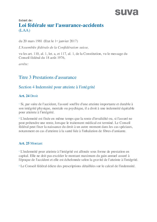 Indemnité pour atteinte à l’intégrité – Extrait de la loi fédérale sur l’assurance-accidents (LAA/2000)