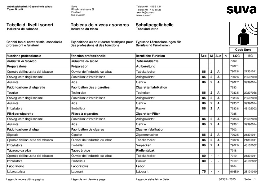 Une exposition élevée au bruit au poste de travail peut durablement nuire à la santé. Les personnes fréquemment exposées à un bruit élevé risquent une perte auditive permanente. Par conséquent, des prescriptions strictes en matière d’émission sonore et de niveau de pression acoustique au poste de travail s’appliquent. Pour protéger efficacement la santé de votre personnel, vous devez d’abord connaître le niveau sonore dans votre entreprise. Comme les mesures sont très complexes à réaliser, nous avons préparé un tableau pour l’industrie du tabac. Ce tableau indique l’exposition au bruit caractéristique de différents métiers et fonctions et détermine les sources de bruits, zones et activités types. Nous vous indiquons donc directement pour quels collaborateurs vous devez prendre des mesures de protection contre le bruit. Téléchargez le tableau de niveaux sonores pour l’industrie du tabac et vérifiez quels sont les postes de travail et les collaborateurs exposés à une émission de bruit trop élevée. La liste des tableaux de niveaux sonores contient plusieurs tableaux portant sur d’autres branches et entreprises qui enregistrent une exposition au bruit élevée.