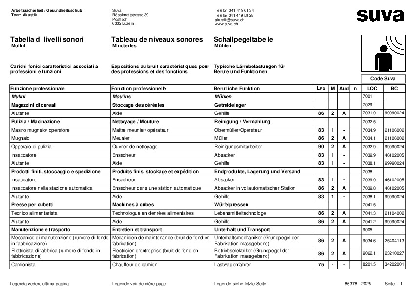 Une exposition élevée au bruit au poste de travail peut durablement nuire à la santé. Les personnes fréquemment exposées à un bruit élevé risquent une perte auditive permanente. Par conséquent, des prescriptions strictes en matière d’émission sonore et de niveau de pression acoustique au poste de travail s’appliquent. Pour protéger efficacement la santé de vos collaborateurs, vous devez d’abord connaître le niveau sonore dans votre entreprise. Comme les mesures sont complexes à réaliser, nous avons préparé un tableau pour le secteur des minoteries. Ce tableau indique l’exposition au bruit caractéristique de différents métiers et fonctions et détermine les sources de bruits, zones et activités types. Nous vous indiquons donc pour quels collaborateurs vous devez prendre des mesures de protection contre le bruit. Téléchargez le tableau de niveaux sonores pour les minoteries et vérifiez quels sont les postes de travail et les collaborateurs exposés à une émission de bruit trop élevée. La liste des tableaux de niveaux sonores contient d’autres tableaux pour d’autres branches et entreprises avec une exposition au bruit élevée.