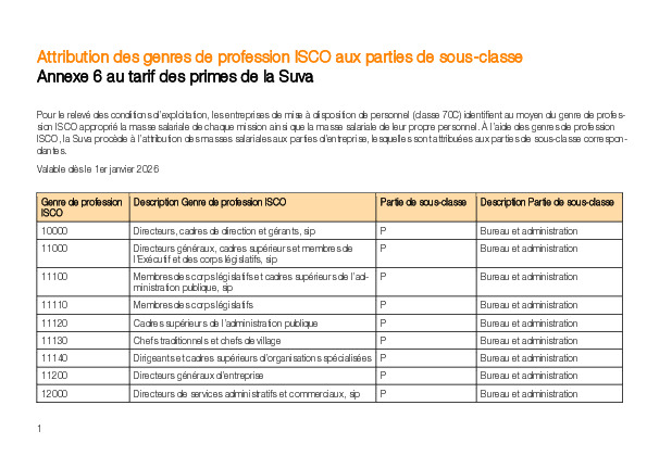 Annexe 6 au tarif des primes de la Suva: Attribution des genres de profession ISCO aux parties de sous-classe