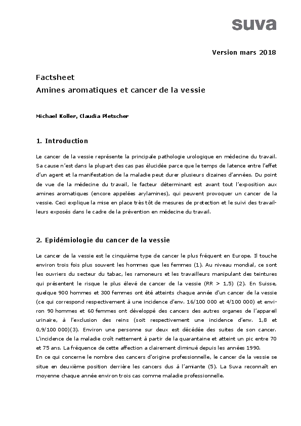 Le cancer de la vessie est le cinquième type de cancer le plus courant en Europe. En Suisse chaque année, environ 900 hommes et 300 femmes sont atteints d’un cancer de la vessie. De plus, près de 90 hommes et 60 femmes env. sont atteints de cancers des autres organes urinaires (reins exclus). Environ une personne sur deux atteinte d’un cancer de la vessie en meurt. La cause du cancer de la vessie reste généralement inconnue en raison des périodes de latence pouvant s’étendre sur des décennies. La cause la plus fréquente est le tabac. La Suva reconnaît en moyenne chaque année environ trois cas comme maladie professionnelle. La médecine du travail est surtout vigilante quant à l’exposition à des amines aromatiques qui peuvent déclencher un cancer de la vessie. Trouver les causes du cancer de la vessie est difficile dans la plupart des cas. Pourtant d’un point de vue de la médecine du travail, il est reconnu que l’exposition à des amines aromatiques (arylamines) peut déclencher un cancer de la vessie. Dans ce cas, on entend par exposition l’absorption des amines aromatiques par la peau ou l’inhalation de vapeurs ou de poussières. Les employ·é·e·s de l’industrie de la chimie, de l’acier et du cuir mais aussi les mécaniciens automobiles ainsi que les techniciennes-dentistes et coiffeurs sont notamment concernés. Cette fiche thématique vous fournit un aperçu de l’occurrence, des causes, du diagnostic du cancer de la vessie ainsi que des informations sur l’effet et l’emploi d’amines aromatiques sans oublier les examens préventifs de la médecine du travail et les aspects liés à la médecine des assurances. Vous trouverez également dans cette fiche thématique des exemples d’amines aromatiques (primaires) ainsi que des informations sur l’occurrence des amines aromatiques, leur toxicologie, leur toxicité et leur emploi. Téléchargez dès maintenant cette fiche thématique sur le cancer de la vessie et les amines aromatiques.