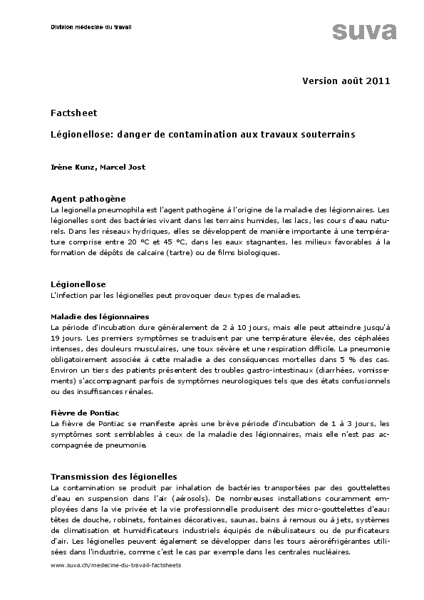 Des informations approfondies sur les légionelles dans le cadre de la médecine du travail (accent mis sur: prise en considération des travaux souterrains) figurent dans cette fiche thématique. Par exemple: