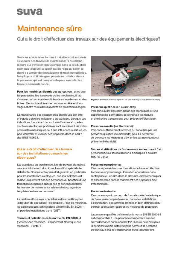 Seule la personne ayant la formation requise peut intervenir sur des équipements, appareils ou installations électriques. Important: s’assurer également que l’outil électrique portatif (perceuses) est en bon état. Notre fiche thématique donne un aperçu des autorisations et personnes habilitées.