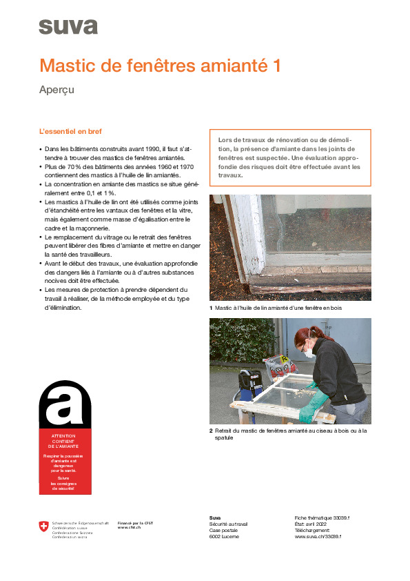 Parmi les matériaux contaminés par l’amiante figurent aussi le mastic de fenêtres amianté et la masse d’égalisation amiantée. Il faut donc s’attendre à trouver de l’amiante lors des travaux de démolition, de rénovation ou de remplacement de fenêtres dans les bâtiments datant d’avant 1990. Dès que vous ou vos travailleurs rencontrez du mastic suspect, dites STOP et demandez un examen. Mais comment retirer du mastic de fenêtres amianté du cadre sans risque pour la santé? La fiche thématique 1 vous donne un aperçu des techniques très différentes. Le procédé est par exemple complètement différent lors de la séparation des vitrages dans le cadre de travaux de démolition et lors du retrait de la masse d’égalisation à l’aide d’une spatule. Toutes les techniques ont tout de même un point commun: elles sont conçues pour éviter que vous et vos travailleurs inhaliez de la poussière d’amiante. Fiches thématiques sur les différentes techniques: Fiche thématique 2 – Retrait au ciseau à bois ou à la spatule en plein air
