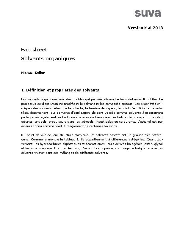 Ce factsheet vous permet de vous informer en profondeur sur les solvants organiques, leur toxicité/toxicologie, les risques potentiels pour la santé et les symptômes qu’ils provoquent généralement. Vous obtiendrez également plus d’informations sur les mesures préventives concernant la manipulation des solvants organiques afin de réduire le risque de développer une maladie. Téléchargez vite ce factsheet afin de vous informer sur les solvants organiques du point de vue de la médecine du travail et sur leurs effets sur la santé.