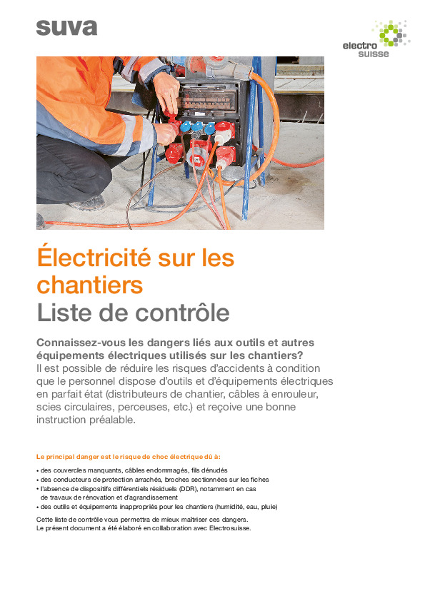 Sur chantier, le matériel est soumis à une usure importante et lors de son utilisation, une négligence est vite arrivée. Il est donc indispensable que vous contrôliez toutes les installations et machines électriques à intervalles réguliers. Le mieux est d’employer pour cela notre liste de contrôle, que nous avons élaborée avec le concours d’Electrosuisse. Elle vous aidera en effet à effectuer les vérifications sur place et à y éliminer les manquements. Le questionnaire aborde les thèmes suivants: achat de machines et d’outils sûrs, contrôle des câbles et des appareils, conditions pour l’électricité de chantier, organisation interne et comportement de vos collaborateurs. Dans notre liste de contrôle, vous trouverez aussi de précieuses indications pour des dispositifs de protection permettant de réduire les risques au minimum. Après avoir complété la liste de contrôle, vous voyez immédiatement où vous devez corriger le tir. Notre fiche de contrôle et de mesures jointe vous aide à planifier et à mettre en œuvre des mesures de sécurité individuelles. Plus vite vous procédez aux améliorations nécessaires, plus vite vous éliminerez les dangers qui guettent sur votre chantier et réduirez ainsi le nombre d’accidents. C’est une bonne chose pour votre personnel, qui apprécie que vous ayez son bien-être à cœur. Et c’est également une bonne chose pour votre entreprise, car les travaux sur le chantier peuvent se poursuivre sans aucun retard en raison d’accidents.