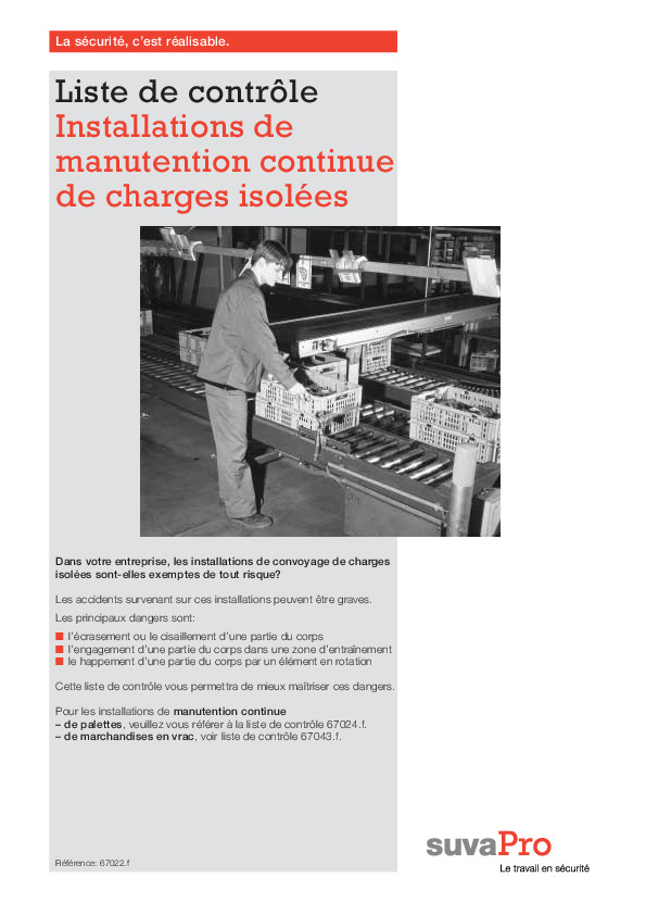 Les installations de manutention de charges isolées n’ont pas l’air dangereuses. Pourtant, des accidents graves se produisent sans cesse sur ces installations. Les doigts, mains ou d’autres parties du corps risquent d’être Cela ne doit pas arriver. Cette liste de contrôle vous aide à contrôler votre installation de manière systématique. Tout d’abord, les zones à risque résultant de la marchandise en mouvement sont identifiées. La marchandise peut cogner contre des éléments fixes de la machine ou du bâtiment et causer un écrasement. De plus, des parties du corps risquent d’être happées par le convoyeur à galets, d’être prises dans les chaînes d’entraînement et pignons des moteurs de convoyage ou de rester coincées dans des garde-corps. Utilisez également cette liste de contrôle pour la formation des collaborateurs et l’entretien. Tenez compte également de nos listes de contrôle pour les installations de manutention continue pour palettes ou transporteurs à bande pour marchandises en vrac.