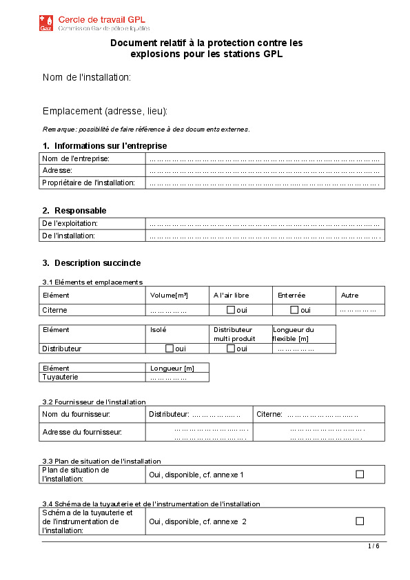 Une station-service GPL doit respecter toutes les mesures de sécurité requises pour une exploitation en toute sécurité. Un incendie ou une explosion aurait inévitablement des conséquences désastreuses. Il est par conséquent décisif que vous vérifiez tous les points pertinents et les mentionniez dans le présent document relatif à la protection contre les explosions afin de pouvoir exploiter votre station-service sans danger. Pour résumer, vous pouvez saisir des informations sur les thèmes suivants dans le document Word: Veuillez remplir ce document pour la mise en service et y joindre les annexes correspondantes, p. ex. le plan de situation, la fiche de données de sécurité du GPL, le plan de zones Ex, l’analyse des risques, les instructions en cas de panne et d’urgence. Le rédacteur et responsable d’exploitation doit signer ce document.
