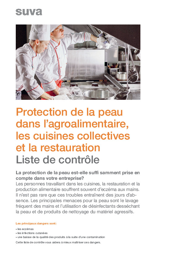 Les personnes qui travaillent dans l’agroalimentaire et la restauration souffrent souvent d’eczéma aux mains. Le problème est dû aux fréquents lavages de mains ainsi qu’à l’emploi de désinfectants qui assèchent la peau et de produits de nettoyage agressifs. Les maladies de la peau peuvent entraîner une incapacité de travail et nécessiter un changement de métier. La liste de contrôle de la Suva aide à éviter de telles situations. Examinez par exemple si vous pouvez remplacer certains désinfectants et produits de nettoyage par d’autres substances moins irritantes pour la peau. Veillez également à fournir à votre personnel des gants appropriés et du savon doux pour la peau. Fournissez des gants de protection et des lotions et des crèmes de soin à votre personnel. Sensibilisez votre personnel aux risques des maladies de la peau. Quand une personne présente des changements cutanés, elle doit immédiatement être examinée par un médecin. Téléchargez la liste de contrôle «Protection de la peau dans l’agroalimentaire, les cuisines collectives et la restauration» et déterminez comment la situation pourrait être améliorée dans votre entreprise. Outre les points à contrôler, cette liste énonce également les principes de la protection de la peau dans l’agroalimentaire et propose un modèle de plan de protection de la peau pour la restauration. Enfin, vous pouvez consulter notre brochure «Protection de la peau au travail» et le dépliant «Trois conseils pour des mains saines». Vous trouverez des gants de protection appropriés pour votre entreprise ici