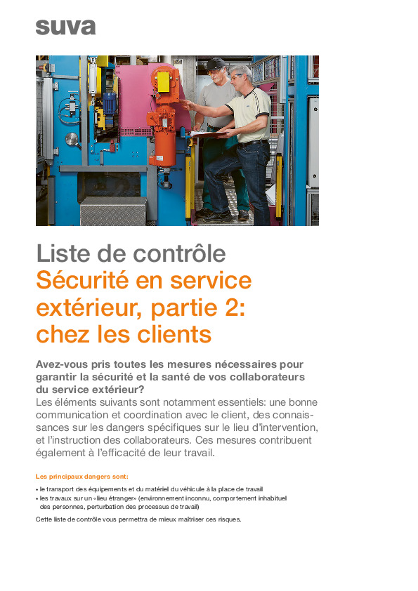 Vos collaboratrices et collaborateurs travaillent en service extérieur? Mais tout d’abord il faut qu’ils arrivent sains et saufs à bonne destination. Connaissez-vous déjà notre liste de contrôle «Sécurité en service extérieur, partie 1: en déplacement»? Il est important de mettre en œuvre, sur place chez le client et pendant les travaux de montage et d’entretien, les mesures de sécurité nécessaires. Car des accidents sont vite arrivés – notamment si le lieu de travail est inconnu et que des imprévus se produisent. La liste de contrôle vous aide à protéger vos collègues. Les éléments essentiels à une prévention des accidents et à la sécurité sur le poste de travail en service extérieur sont une bonne communication, la coordination avec le client, des connaissances des dangers spécifiques sur le lieu d’intervention et les instructions données au personnel. Tout cela contribue à améliorer l’efficacité des travaux sur place. Cette liste de contrôle couvre tous ces aspects. Téléchargez la liste de contrôle et évaluez la situation dans votre entreprise à l’aide des questions. De nombreuses illustrations et photos vous aident à faire les bons constats. De plus, la liste de contrôle contient des informations supplémentaires, par exemple quels renseignements concernant les cas d’urgence vos collègues doivent demander sur place. Dans un second temps, vous consignez sur la liste de contrôle les mesures qui doivent encore être appliquées dans votre entreprise.Une aide pour les détails est également fournie. Car la liste de contrôle contient des indications sur les moyens auxiliaires possibles.Par exemple: Utilisez ces listes de contrôle – vos collaboratrices et collaborateurs et vous-même êtes ainsi en sécurité!