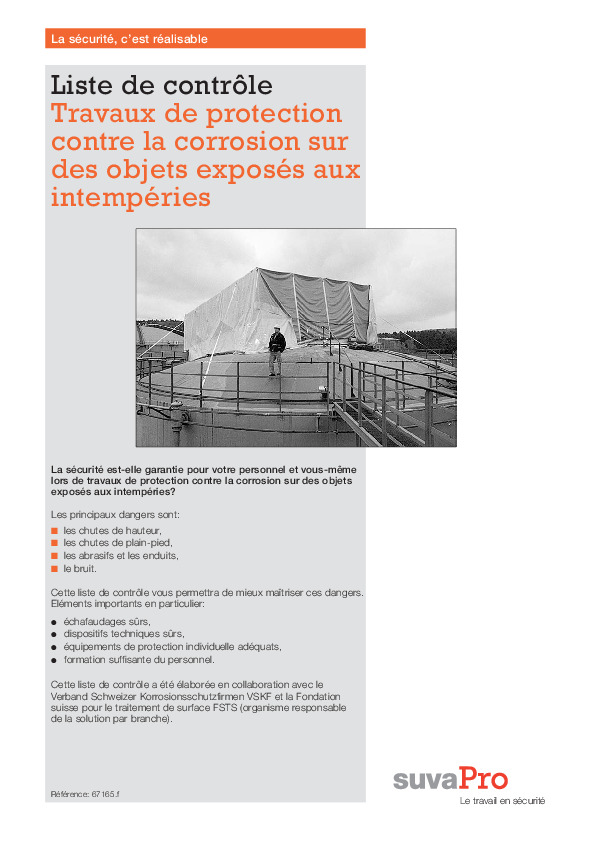 Chose positive néanmoins, avec les bons dispositifs de sécurité, vous pouvez prévenir efficacement les accidents. Mais où devez-vous agir dans votre entreprise? Notre liste de contrôle vous rendra ici de précieux services. Cette liste de contrôle a été élaborée en collaboration avec le Verband Schweizer Korrosionsschutzfirmen (VSKF) et la Fondation suisse pour le traitement de surface (FSTS).