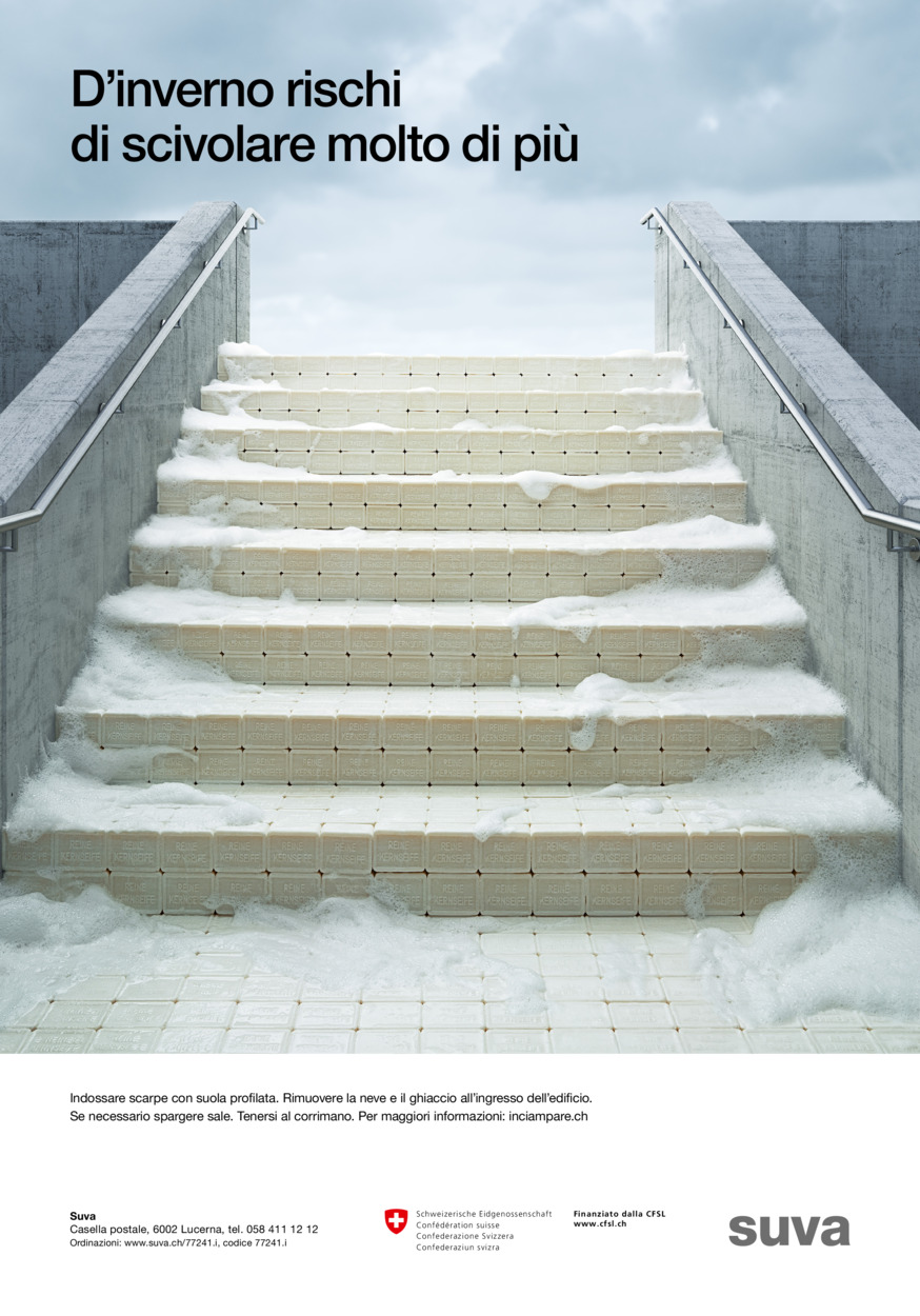 Inciampare e cadere sono le cause di infortunio più frequenti in Svizzera. Un quarto degli infortuni da caduta si verifica sulle scale. In inverno il rischio di infortuni aumenta rapidamente perché la neve e il ghiaccio rendono scivolosi sia ingressi che scale. In inverno il rischio di cadere è particolarmente accentuato fra le 6 e le 9 del mattino. Le cadute sono dovute principalmente a fretta, disattenzione, scarsa visibilità e calzature non adatte. Bastano poche misure preventive per ridurre sensibilmente il rischio di infortuni da caduta. Liberate da neve e ghiaccio gli ingressi, i marciapiedi e le scale. Se necessario usate il sale antigelo. Ricordate che in certi casi potreste essere ritenuti responsabili per gli infortuni a seguito di scivolamento. Anche i vostri collaboratori possono fare molto per contribuire alla propria sicurezza.Soprattutto in inverno dovrebbero ad esempio indossare scarpe con la suola scolpita, tenersi al corrimano salendo le scale e non farsi distrarre dal cellulare. Il nostro manifesto «Attenzione: rischio di scivolamento! Ecco come prevenire le cadute d'inverno» dovrebbe sensibilizzare il personale sui rischi legati alla stagione invernale. Ordinate il manifesto o scaricatelo e affiggetelo in posizione ben visibile, ad esempio nel locale destinato alla pausa. Utilizzate anche il nostro pieghevole «8 consigli per evitare brutte cadute d'inverno» Maggiori informazioni su come prevenire gli infortuni da caduta e inciampo sono disponibili alla pagina web «Cadute in piano».