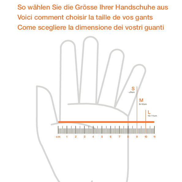 I guanti proteggono dalle malattie cutanee. Le persone che maneggiano sostanze aggressive o che svolgono frequentemente lavori a contatto con l’umidità dovrebbero proteggere le mani. Ma è fondamentale scegliere la taglia di guanti giusta. A tale scopo, stampare la sagoma su un foglio A4 e appoggiarci sopra la mano. Saprete così qual è la vostra taglia.