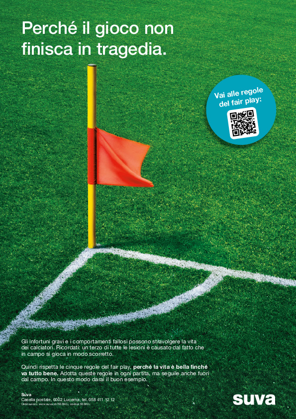Appendete questo manifesto nella vostra azienda e spronate gli appassionati di calcio del vostro organico a essere corretti e a rispettare le regole del fair play. In questo modo non solo contribuirete a evitare sofferenze e dolori, ma anche a ridurre i periodi di assenze e i costi che l’azienda deve sostenere.