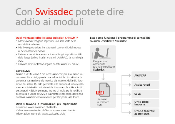 Le dichiarazioni dei salari arrivano alla Suva e agli altri destinatari direttamente dal vostro software di contabilità salariale. Il volantino presenta in sintesi le informazioni più importanti sullo Standard salari CH (ELM) di Swissdec. Cos'è «ELM» e dove posso trovare le informazioni principali.