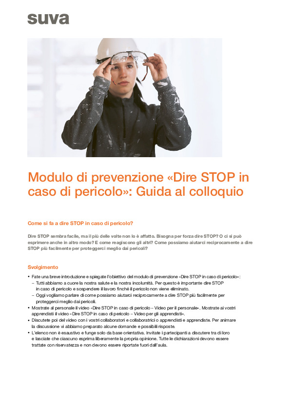 La guida al colloquio sul modulo di prevenzione «Dire STOP in caso di pericolo» contiene domande esemplificative. Le domande sono uno strumento orientativo per voi quadri direttivi e vi aiutano a moderare i colloqui con le vostre collaboratrici e i vostri collaboratori.