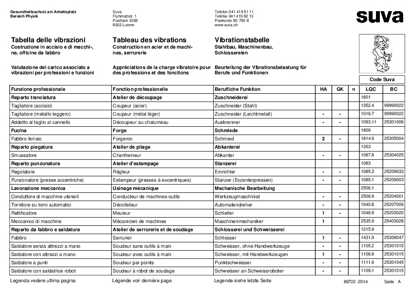 A seconda dell’intensità, della frequenza, della durata e della modalità di lavoro (postura), le forti vibrazioni possono minacciare la salute o addirittura danneggiarla. Le vibrazioni possono avere due tipi di effetti sul corpo umano: vibrazioni trasmesse al sistema mano-braccio (HAV) e vibrazioni trasmesse al corpo intero (GKV). Il pericolo per la salute è legato, dunque, anche al punto di ingresso nel corpo umano. Se i lavoratori delle imprese che operano nella costruzione in acciaio e di macchine e nelle officine da fabbro sono esposti a vibrazioni eccessive, si possono manifestare diversi disturbi a seconda della tipologia, dell’intensità e della durata dell’esposizione. Diversamente da molti altri pericoli, per le vibrazioni non esistono dispositivi efficaci di protezione individuale. Pertanto, risulta ancora più importante adottare le tecniche opportune per ridurre l’esposizione alle vibrazioni. Per proteggere la salute dei vostri collaboratori abbiamo realizzato questa tabella delle vibrazioni. La tabella riporta la valutazione dell’esposizione alle vibrazioni per funzioni professionali selezionate così come i valori tipici delle vibrazioni di apparecchi e macchine. Infine mostriamo due diverse misure da adottare. L’elenco delle tabelle delle vibrazioni riporta altre tabelle di valori di altri settori dove l’esposizione alle vibrazioni è elevata.