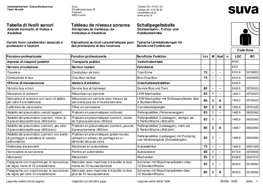 Una forte esposizione al rumore sul posto di lavoro può danneggiare la salute in modo permanente. Le persone esposte ripetutamente a forti rumori rischiano una perdita permanente dell’udito. Per questa ragione sono previste norme severe per le emissioni sonore e i livelli di pressione sonora sul posto di lavoro. Per poter proteggere la salute del vostro personale in maniera efficace, dovete sapere innanzitutto quanto sono elevati i livelli sonori nella vostra azienda. Poiché le relative misurazioni sono piuttosto complesse, abbiamo elaborato una tabella specifica per le aziende di trasporto. Questa tabella elenca la tipica esposizione al rumore delle singole professioni e funzioni e stabilisce le tipiche fonti di rumore, zone e attività. In questo modo vi mostriamo direttamente per quali collaboratrici e collaboratori dovete adottare misure di protezione dal rumore. Scaricate la tabella di livelli sonori per le aziende di trasporto e verificate quali posti di lavoro e quali collaboratori sono esposti a forti emissioni di rumore. L’elenco delle tabelle di livelli sonori riporta altre tabelle di valori di altri settori e aziende con elevata esposizione al rumore.