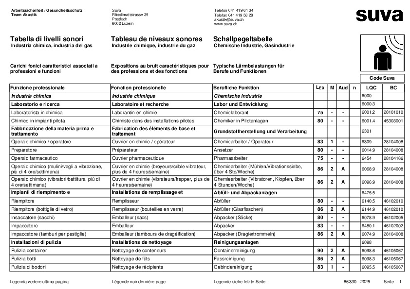 La forte esposizione al rumore sul posto di lavoro può danneggiare permanentemente la salute. Le persone esposte ripetutamente a un forte livello di rumore rischiano di perdere l’udito in modo permanente. Per questa ragione si applicano norme rigide per le emissioni sonore e i livelli di pressione sonora sul posto di lavoro. Per poter proteggere la salute del personale in maniera efficace occorre conoscere il livello sonoro nell’azienda. Poiché le relative misurazioni sono piuttosto complesse, abbiamo elaborato una tabella specifica per l’industria chimica. Questa tabella elenca la tipica esposizione al rumore delle singole professioni e funzioni e stabilisce le tipiche fonti di rumore, zone e attività. In questo modo vi mostriamo direttamente quali misure antirumore dovete adottare per proteggere il vostro personale. Scaricate la tabella di livelli sonori per l’industria chimica e verificate quali posti di lavoro e quali collaboratori sono esposti a emissioni di rumore troppo elevate. L’elenco delle tabelle di livelli sonori riporta altre tabelle di valori di altri settori e aziende dove l’esposizione al rumore è elevata.