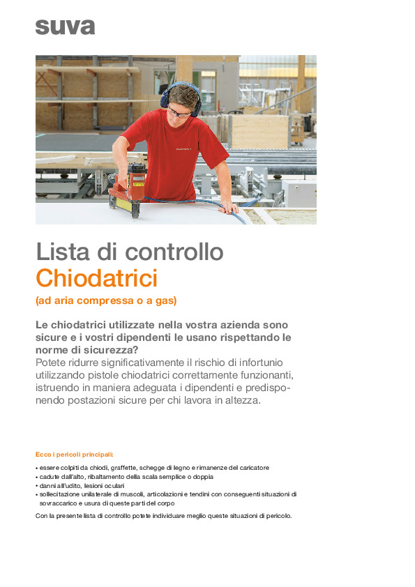 Inoltre trovate informazioni sul comportamento da adottare o su come garantirne l'uso sicuro, per esempio su una scala con piattaforma. Osservando regole semplici prevenite gli infortuni dei collaboratori causati da chiodi e graffette. Inoltre riducete il rischio di cadute, danni all'udito o lesioni agli occhi. In più controllate che siano sempre indossati i dispositivi di protezione adeguati, come gli occhiali. Scaricate subito la lista di controllo e verificate l'uso sicuro delle pistole. Così voi e il vostro personale saprete come gestire i pericoli.