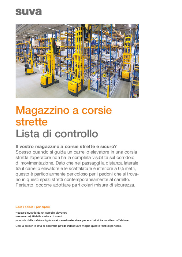 Le merci sulle scaffalature alte vengono spesso gestite con i carrelli elevatori a forche. Le corsie tra gli scaffali sono strette per ottimizzare la superficie di deposito e comportano alcuni pericoli: Per questi motivi occorre prestare la massima cautela. La nostra lista di controllo contiene preziosi suggerimenti per evitare infortuni. Per la protezione personale si possono applicare scanner e sensori per proteggere l'area davanti e dietro il carrello elevatore. Anche un divieto di accesso può prevenire collisioni tra carrelli elevatori e altri collaboratori. Ulteriori punti da verificare sono l'illuminazione, le condizioni del magazzino a scaffali alti e la formazione. Assicuratevi che i carrellisti indossino abbigliamento ad alta visibilità, frequentino la necessaria formazione per la conduzione di carrelli elevatori a forche (categoria R2) e dispongano delle informazioni relative alle regole di sicurezza nei magazzini a corsie strette.