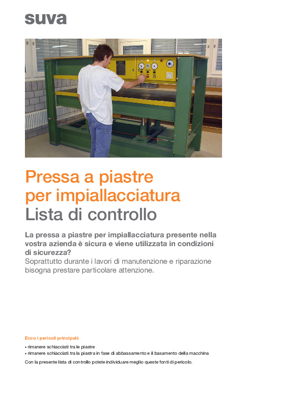 La lavorazione con le presse di qualsiasi tipo - a piastre per impiallacciature, a ciclo breve, multipiano ecc. - può essere pericolosa. Il pericolo maggiore è che il personale resti schiacciato tra le piastre o tra le piastre e il basamento della macchina. Una particolare cautela è richiesta per la manutenzione e la pulizia delle macchine. Una serie di misure tecniche impedisce lo schiacciamento durante l'uso della pressa a piastre per impiallacciatura. Assicuratevi, per esempio, che non sia possibile un abbassamento accidentale delle piastre. Inoltre deve essere presente un dispositivo di disattivazione per impedire che una piastra in fase di abbassamento schiacci persone o parti del corpo. Inoltre istruite il vostro personale sull'uso sicuro delle presse. L'ideale è redigere delle regole di sicurezza specifiche per l'azienda per l'uso sicuro delle macchine. Il nostro bollettino «Regole chiare per tutti» vi aiuta a formulare queste regole. Utilizzate la nostra lista di controllo «Pressa a piastre per impiallacciatura» per verificare le carenze della sicurezza delle presse nella vostra azienda ed assumere le misure di sicurezza. La lista di controllo mostra inoltre le possibili soluzioni per rendere sicure le presse. Così potete gestire meglio i pericoli.
